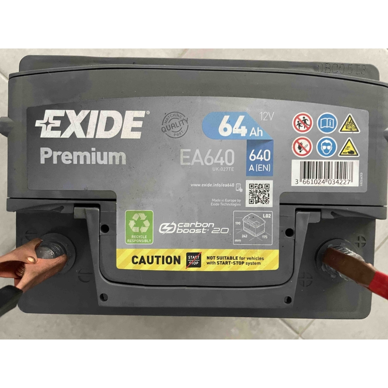Compré una batería Exide Premium EA640 64Ah para sustituir una de 60Ah. La pedí un viernes y me llegó el lunes. Sólo llevo dos días con ella, noto el coche rejuvenecido (ya tiene 16 años). Consulté por mi cuenta y todo indica que acerté. Me llegó bien protegida en una caja de cartón. Bien también por el repartidor.