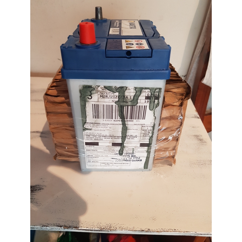 La batería llegó en 24 horas, pero con el embalaje mojado en ácido. Esto fue medido con una tira reactiva de ph y efectivamente era ácido de batería que se había derramado. Probablemente el transportista volcó la batería en algún momento. Nunca más.